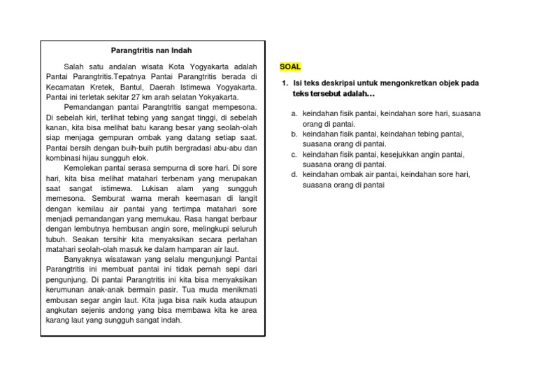 Perasaan Pembaca Kepada Teks Deskripsi Pantai Parangtritis Nan Indah Adalah. Takjub keindahan pantai parangtritis b. Terpesona keindahan pantai parangtritis d.